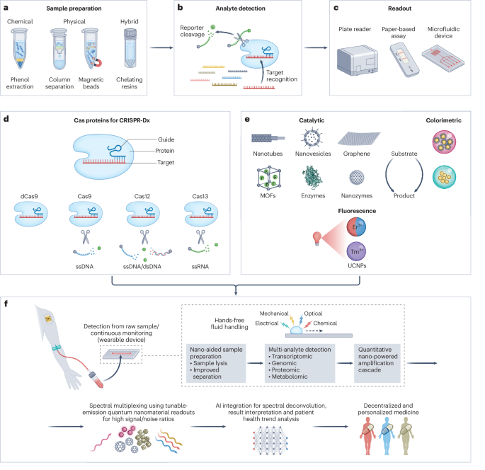Broto, M. et al. Nanozyme-catalysed CRISPR assay for preamplification-free detection of non-coding RNAs. Nat. Nanotechnol. 17, 1120–1126 (2022). This research launched CrisprZyme, a nanozyme-linked immunosorbent assay that permits preamplification-free, quantitative detection of non-coding RNAs in each plate- and paper-based assay codecs.